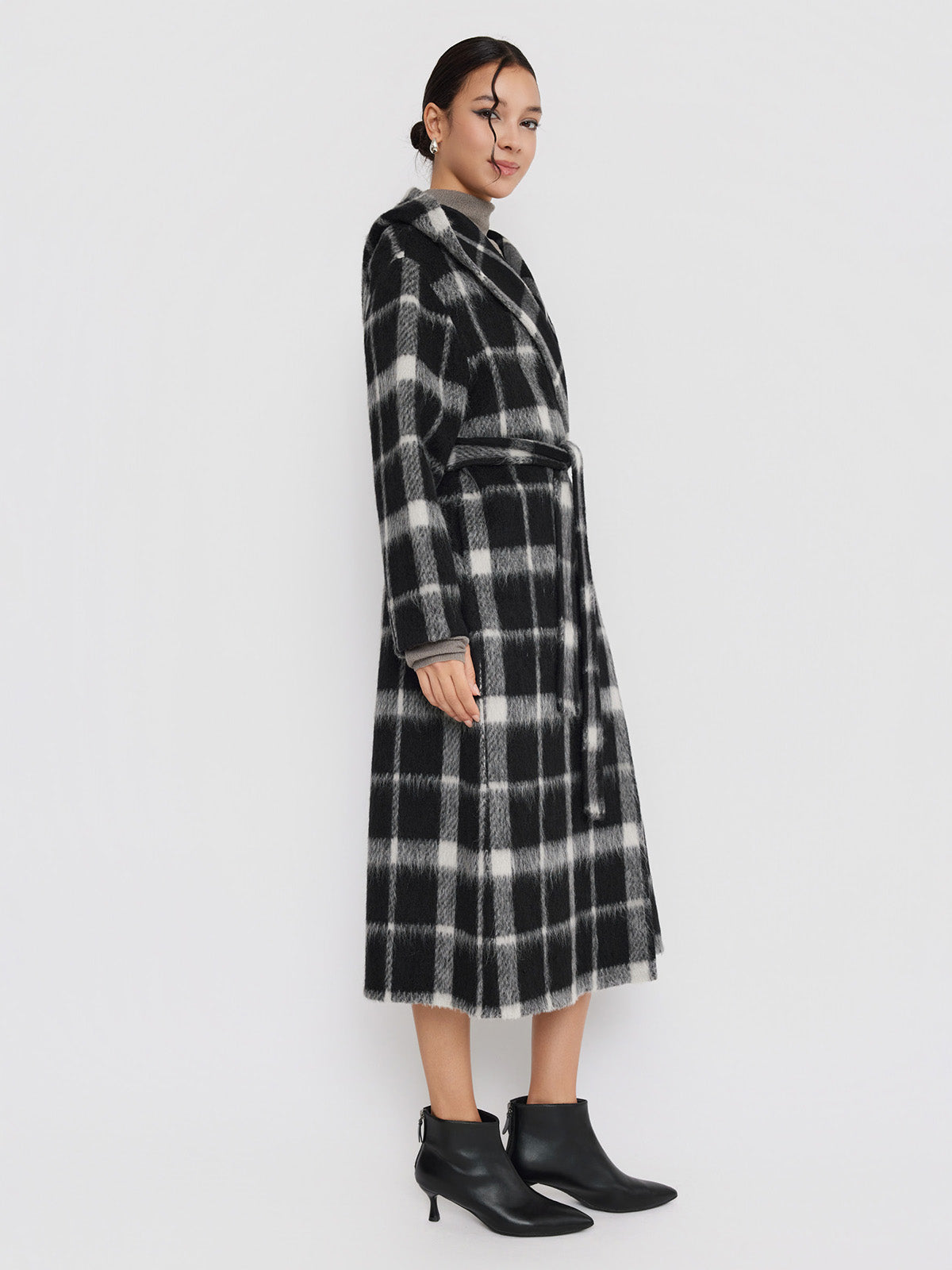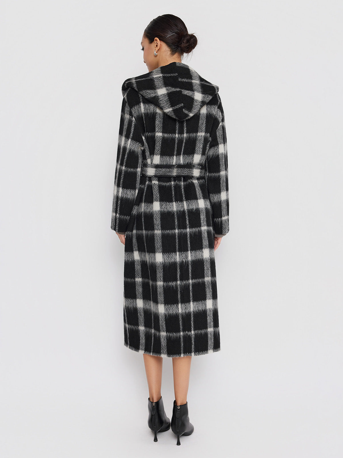 This hooded coat features a removable belt and side seam pockets for a streamlined look. Expertly crafted from a soft wool-alpaca blend with Tencel and polyester, it provides natural warmth, a plush feel, and durability with resistance to wrinkles and pilling. The classic black-and-white check adds a subtle vintage-inspired touch to the minimalist silhouette.