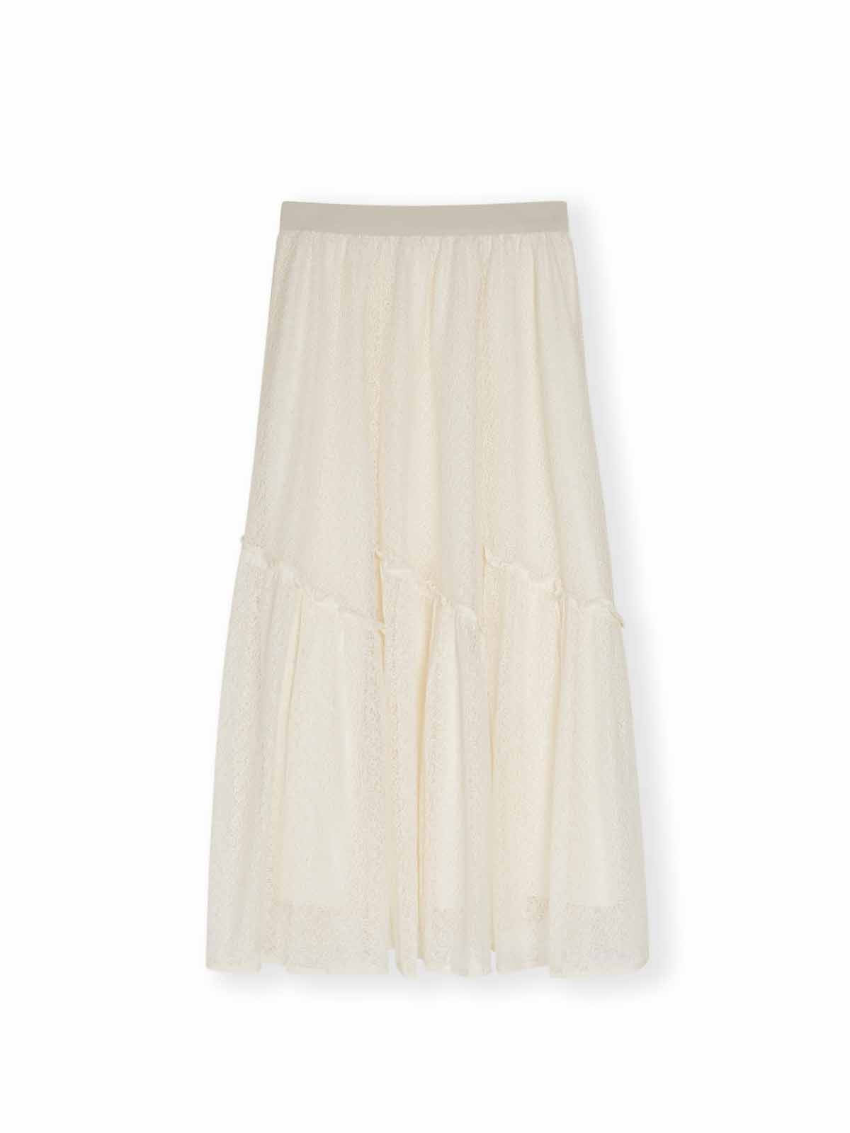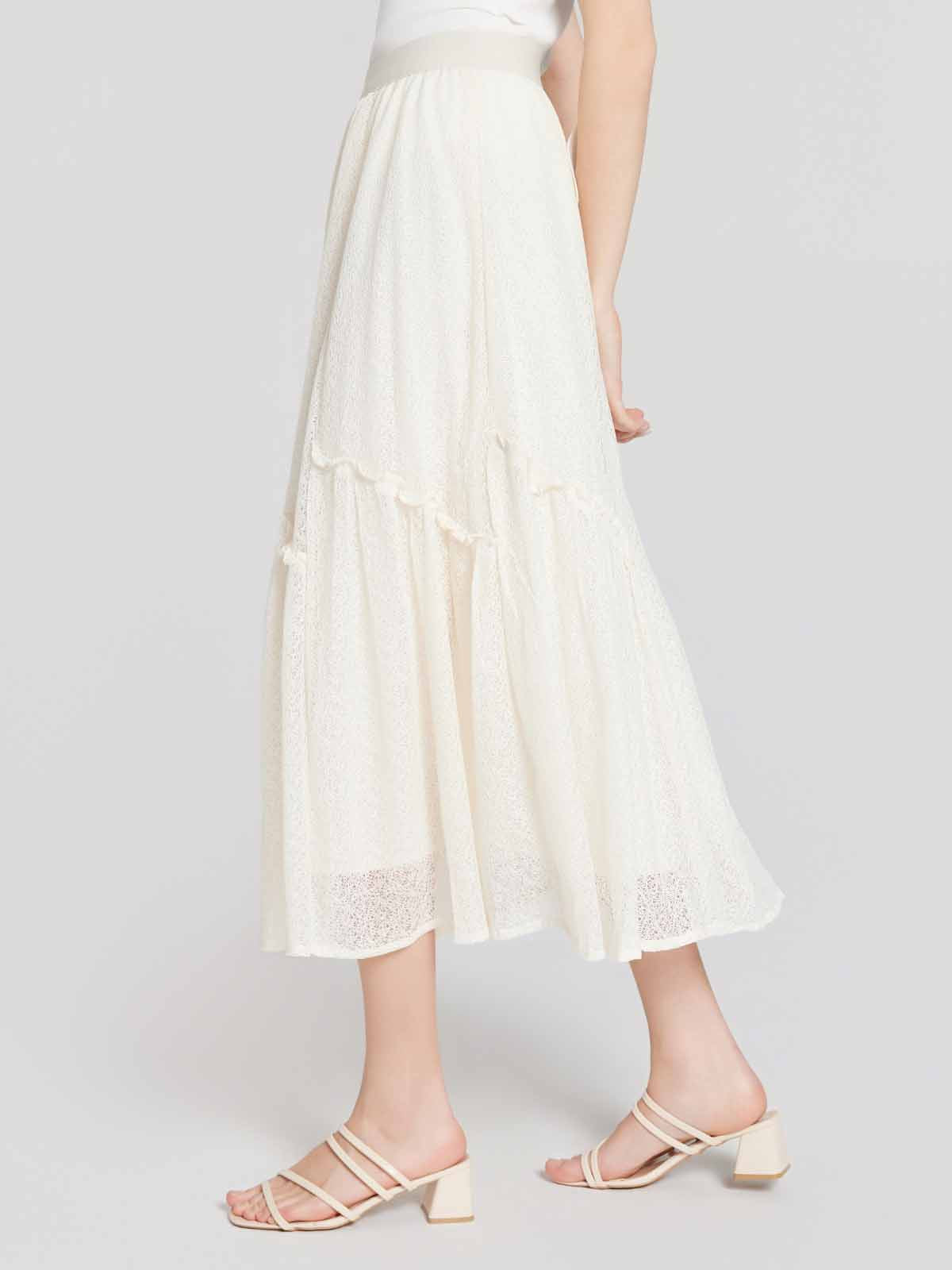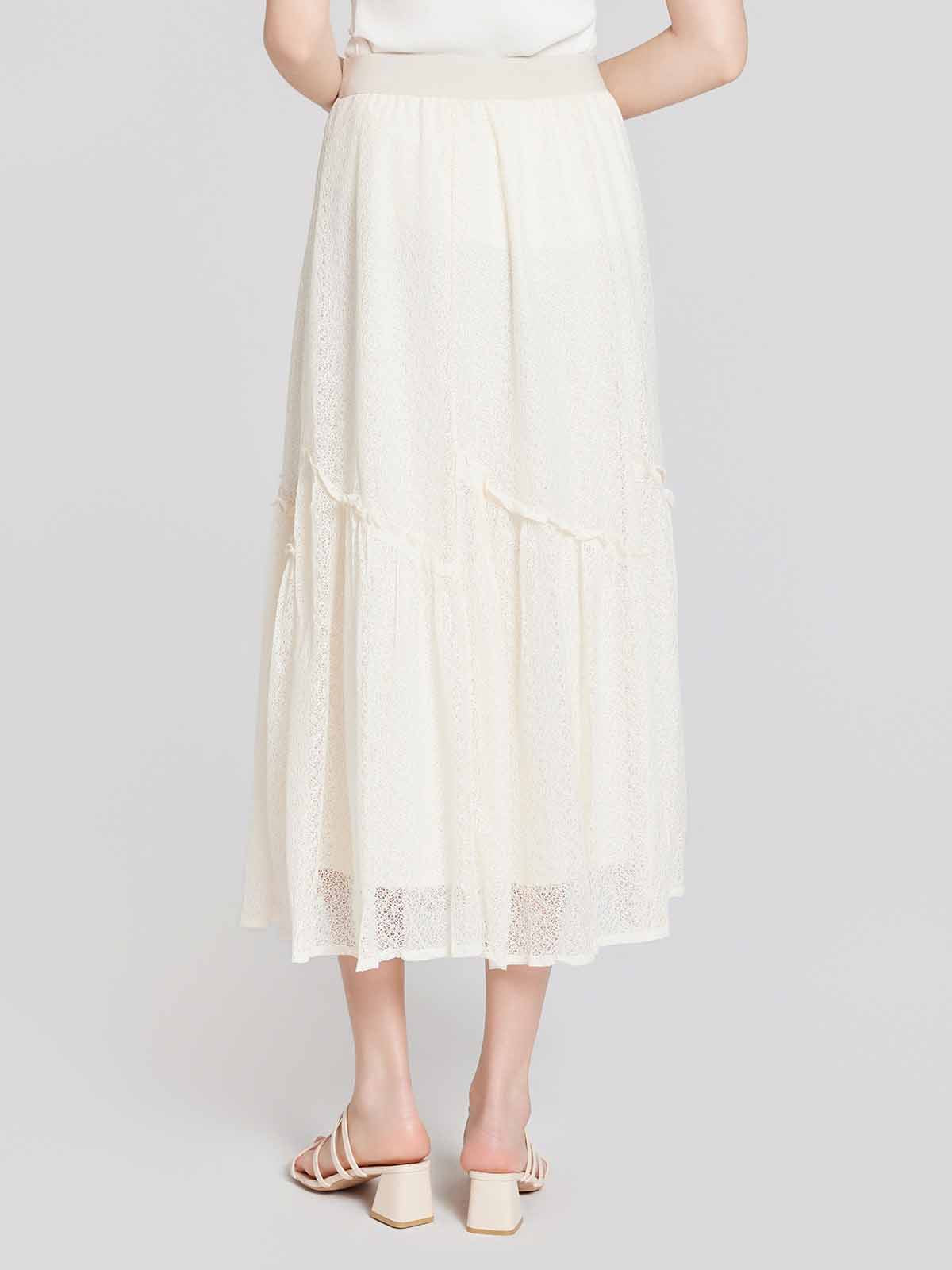 The elastic-waist midi skirt skims the body with a classic fit, featuring a flowing silhouette and delicate lace jacquard that glimmers subtly as you move.