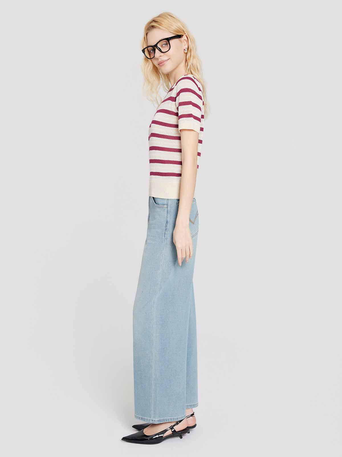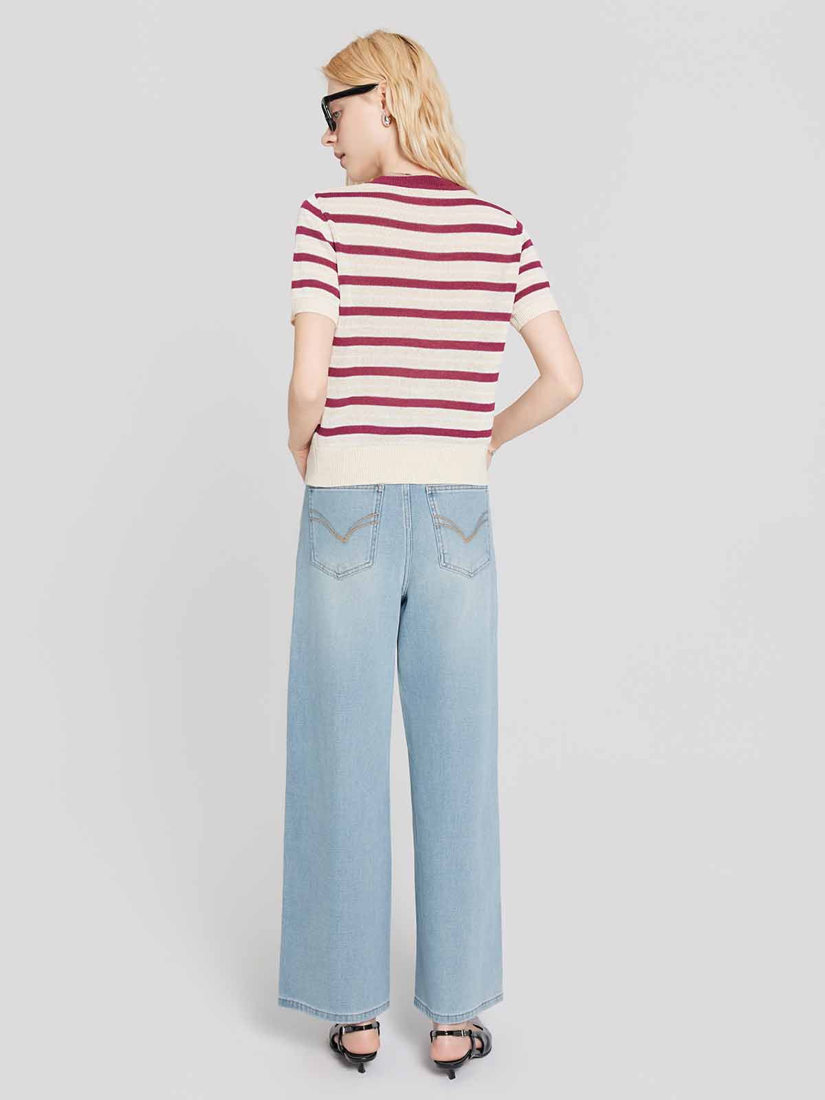 The short-sleeve slim knit features a round neck and colorblock stripes for a classic, flattering fit that highlights the shoulders and torso. Perfect on its own or paired with the matching cropped knit for a coordinated twin set look.