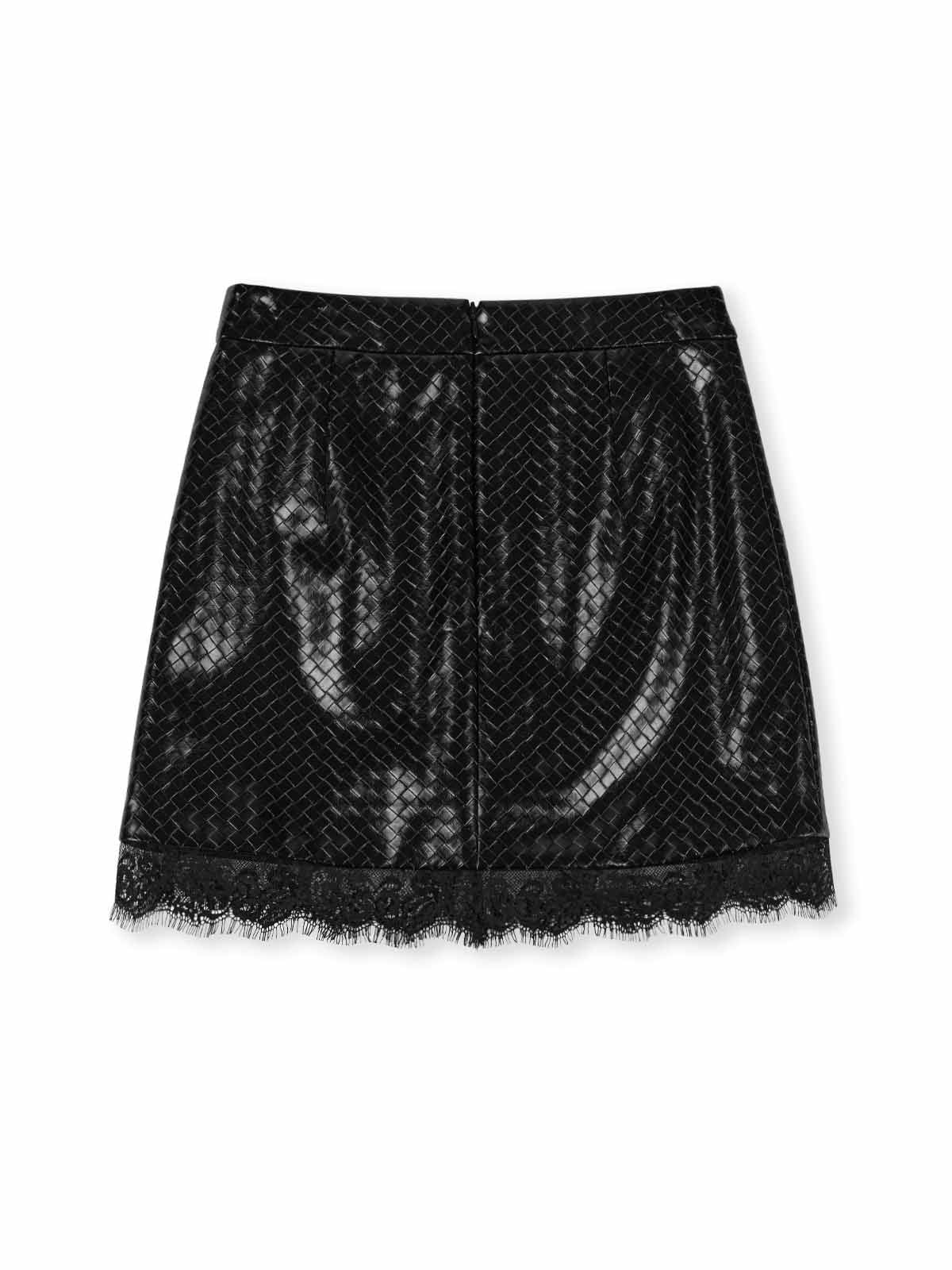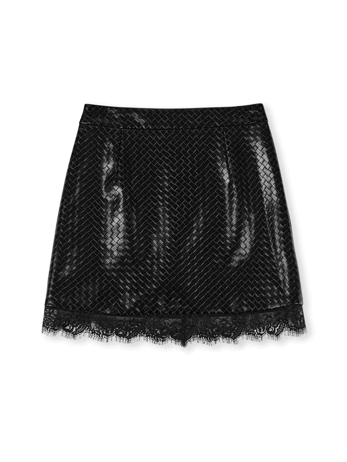 This skirt is made from black PU with a subtle woven-effect texture that adds depth and refinement. Finished with delicate lace trim along the hem, it creates a striking contrast between structured shine and soft femininity. The clean silhouette balances edge and elegance, making it easy to style from day to night.