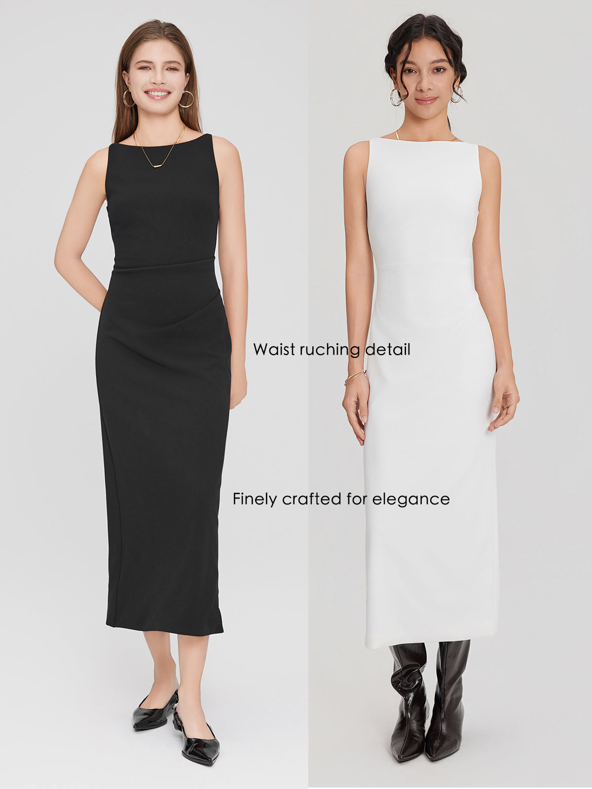 This is a sleeveless high-neck midi dress with a body-skimming silhouette. It’s made from stretch bonded crepe that cinches at the waist and hips, with subtle gathering for added comfort.
