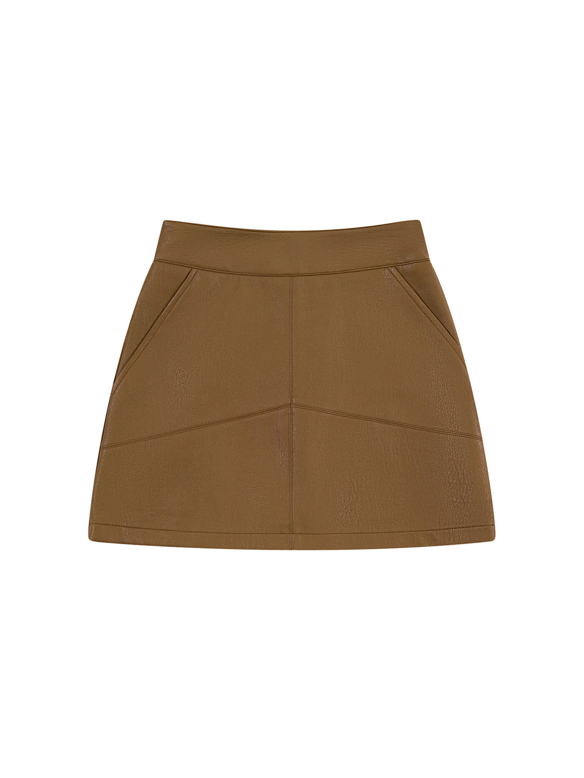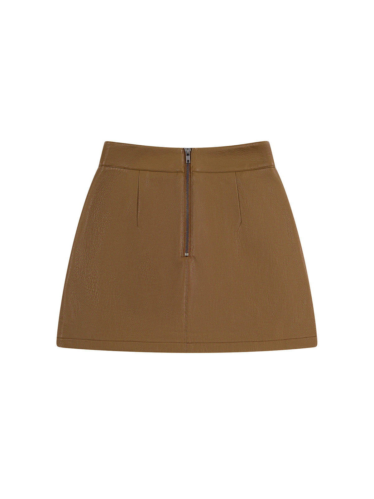 sleek mini skirt finished with a back metal zipper and knit lining shorts for comfort and coverage. Made from supple eco-friendly PU leather with a soft, refined texture.