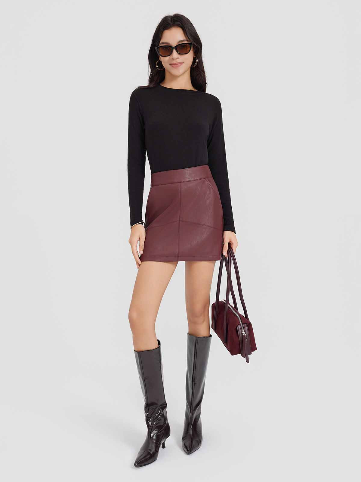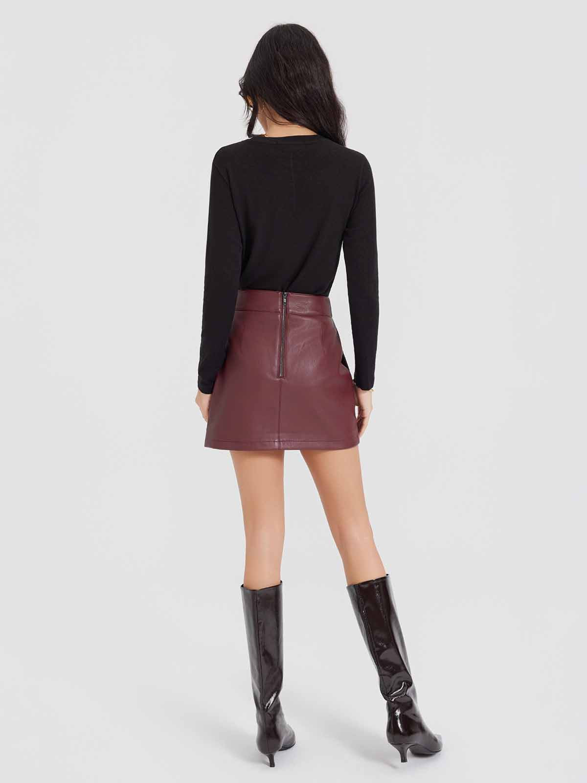 sleek mini skirt finished with a back metal zipper and knit lining shorts for comfort and coverage. Made from supple eco-friendly PU leather with a soft, refined texture.
