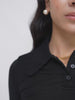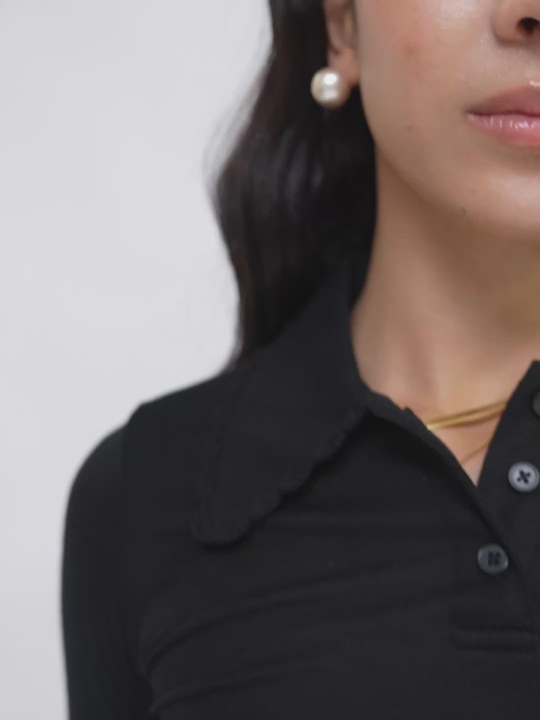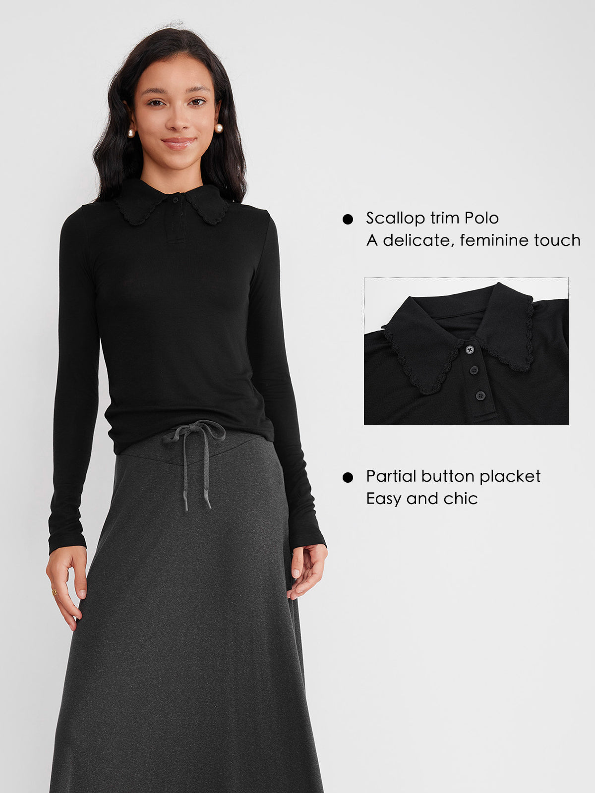 A polo-style knit with a scalloped collar and partial button placket that adds a refined, feminine touch. Crafted from a soft Tencel wool blend for breathable comfort and a polished finish.