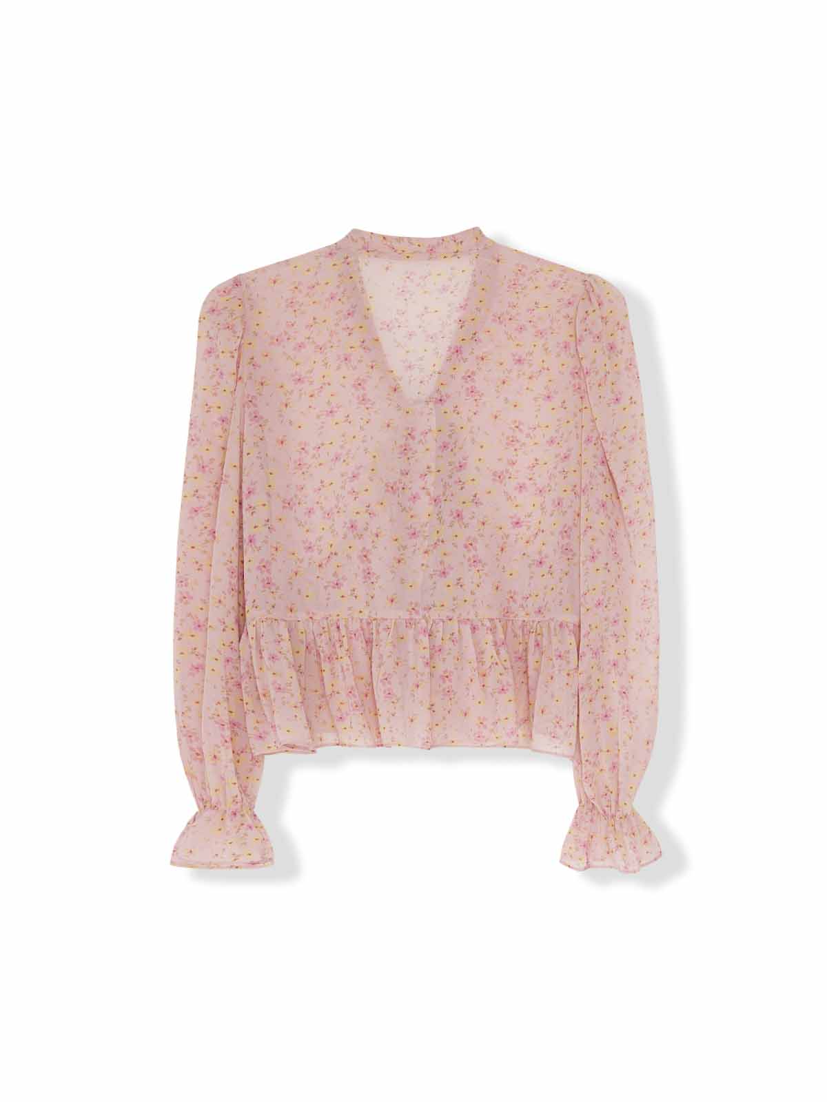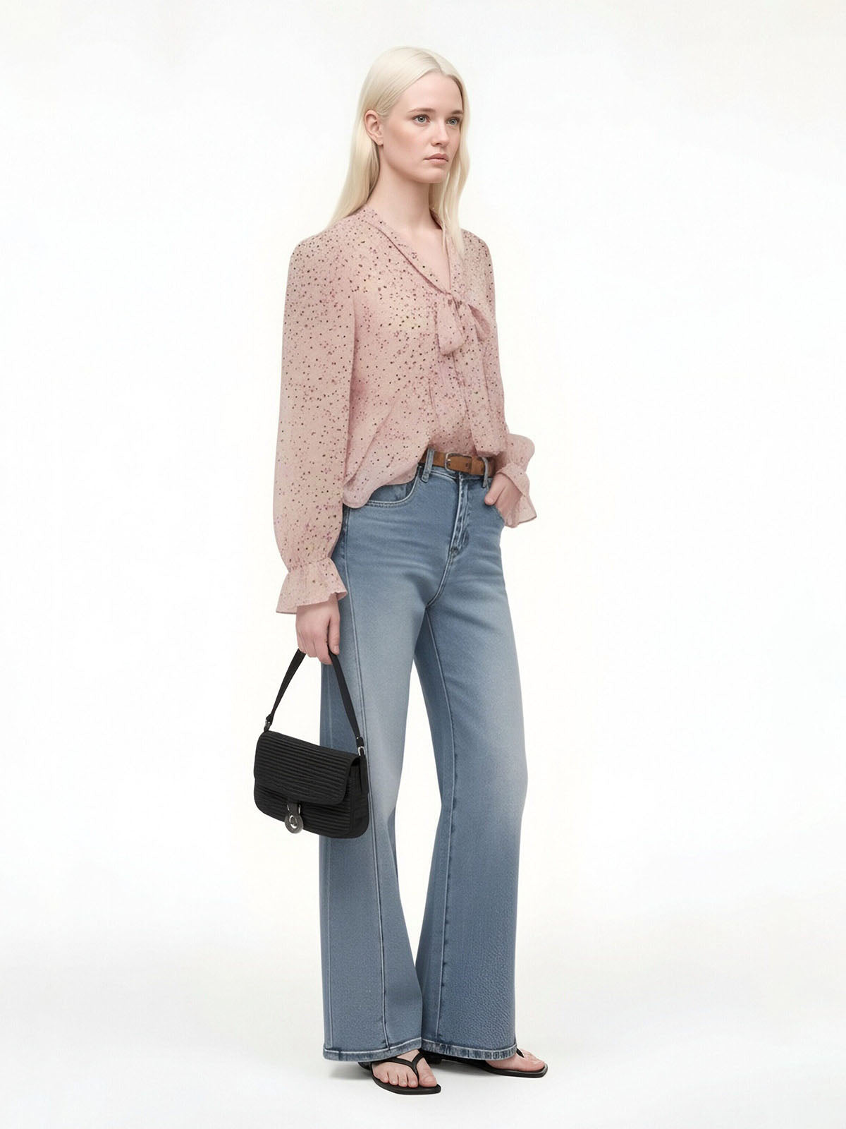 The cropped blouse features a V-neck and flowing tie detail, with a playful silhouette that flatters the waist and adds feminine movement.