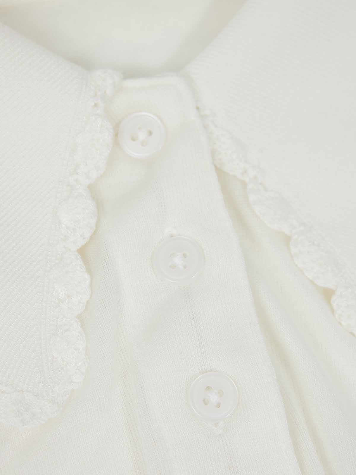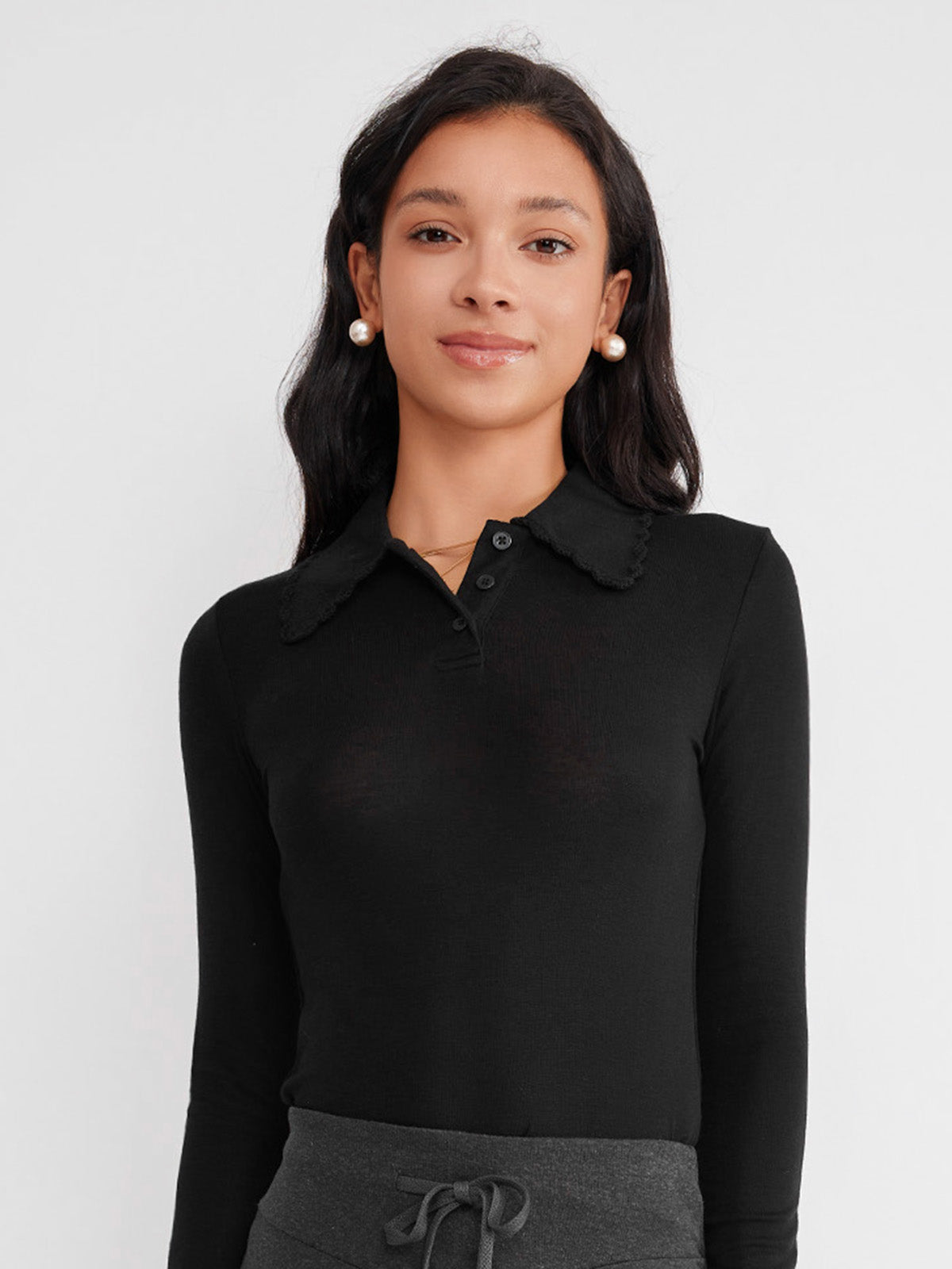 A polo-style knit with a scalloped collar and partial button placket that adds a refined, feminine touch. Crafted from a soft Tencel wool blend for breathable comfort and a polished finish.
